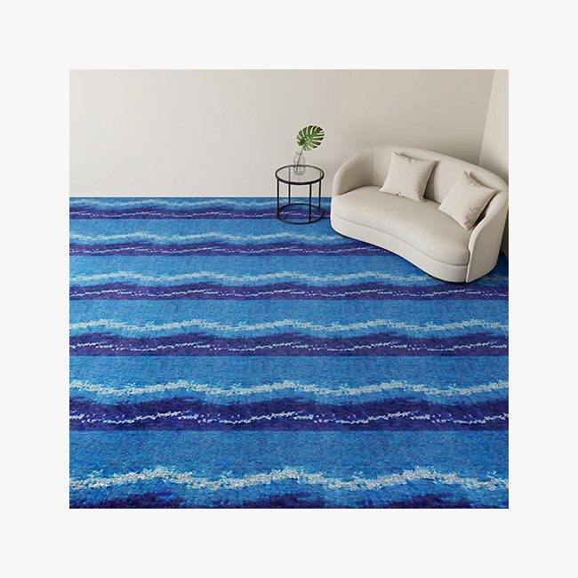Terinspirasi oleh elemen alam, Karpet Al Kabir Blue menampilkan motif gelombang abstrak bergelombang (wave patterns) yang terbentuk dari benang berwarna putih bersih. Garis-garis putih ini membelah gradasi warna dasar karpet secara horizontal, menciptakan efek visual layaknya buih ombak di lautan atau sapuan awan di langit malam. Teksturnya yang bervariasi memberikan kedalaman visual yang membuat ruangan tampil lebih dinamis namun tetap elegan.