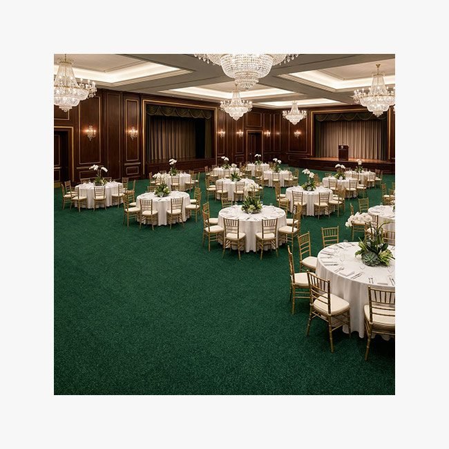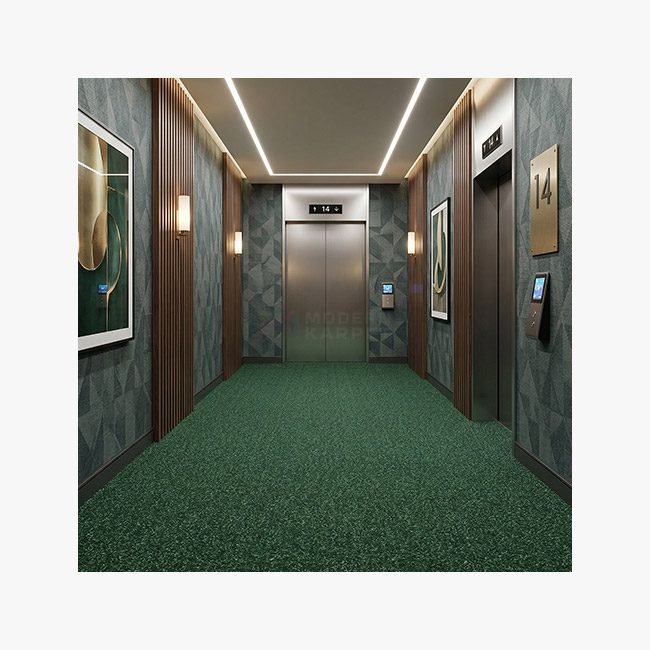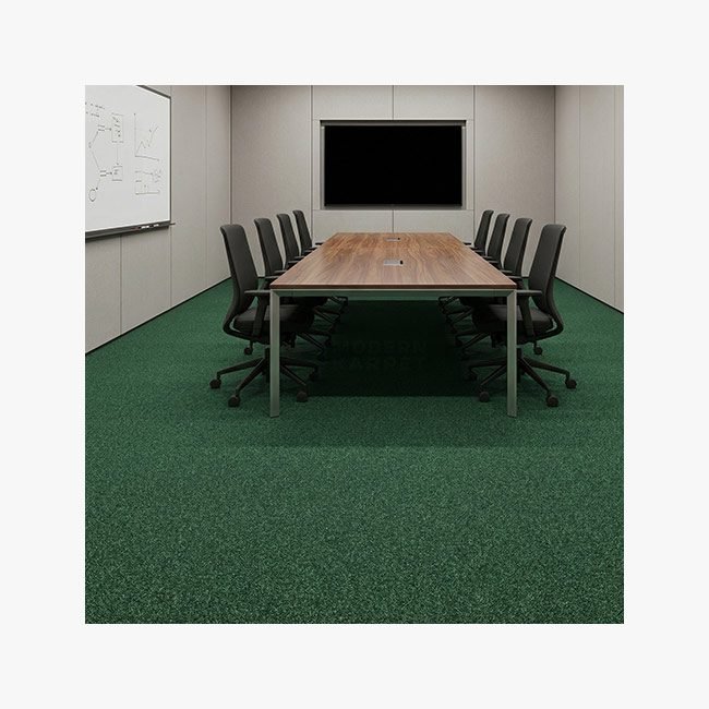 Sesuai dengan detail visualnya, Karpet Monte Carlo 05 Green menampilkan permukaan solid tanpa corak (plain) yang menonjolkan kemewahan dari materialnya itu sendiri. Tekstur cut pile-nya yang padat mampu merespons cahaya ruangan dengan indah—terutama di bawah pendaran lampu bersuhu netral hingga hangat—menciptakan efek gradasi warna alami (shading) yang dinamis saat dipijak. Tampilannya sangat bersih, rapi, dan profesional, membuat ruangan tampak lebih lapang dan berkelas.